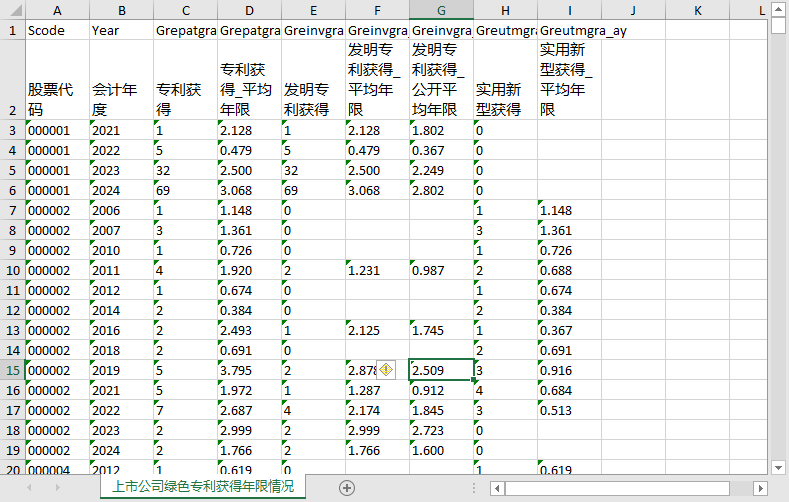 [2]上市公司绿色专利获得情况: 1990~ 2024 股票代码、会计年度、公司类型、获得时间、当年独立获得的发明数量、当年独立获得的实用新型数量、当年独立获得的外观设计数量、当年联合获得的发明数量、当年联合获得的实用新型数量、当年联合获得的外观设计数量