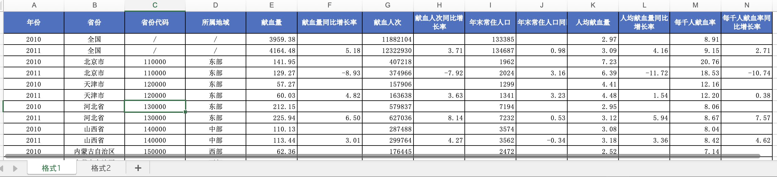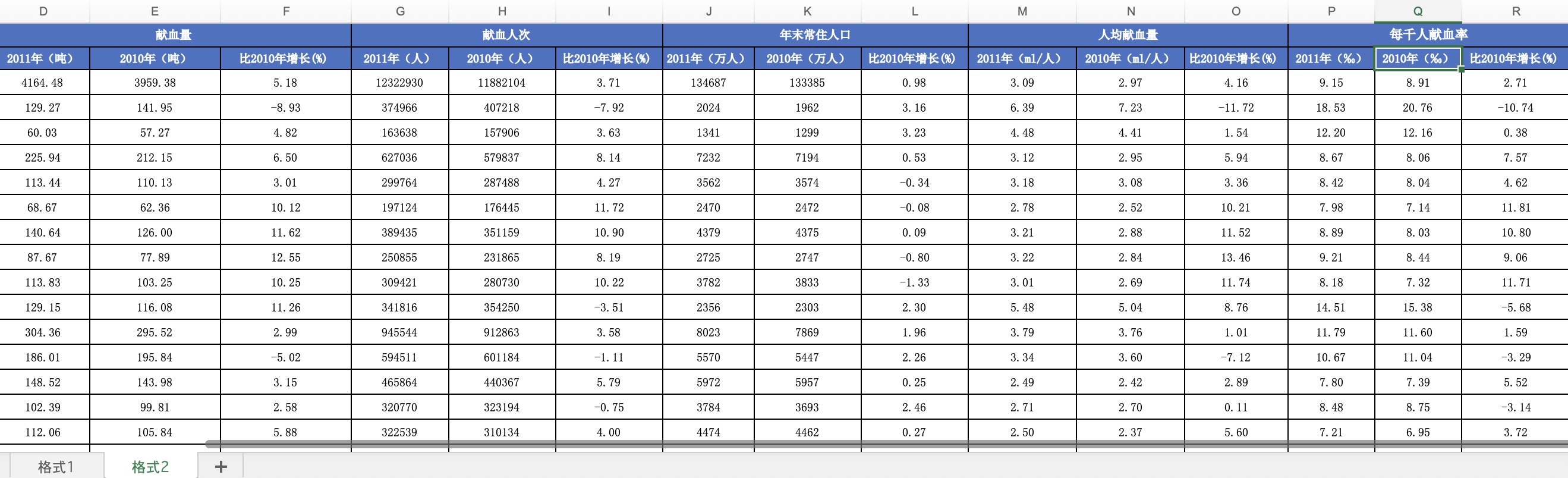 中国31省份无偿献血量、人均献血量与献血率面板数据(2010-2011年,含同比指标与常住人口口径)