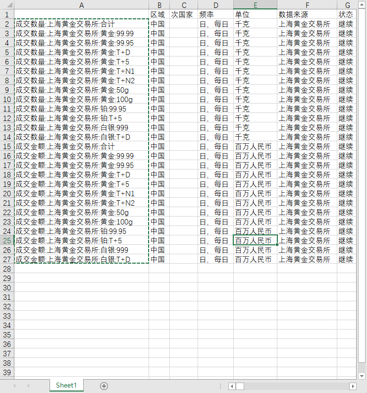 收盘价:上海黄金交易所:黄金:99.99 收盘价:上海黄金交易所:黄金:99.95 收盘价:上海黄金交易所:黄金:T+D 收盘价:上海黄金交易所:黄金:T+5 收盘价:上海黄金交易所:黄金:T+N1 收盘价:上海黄金交易所:黄金:T+N2 收盘价:上海黄金交易所:黄金:50g 收盘价:上海黄金交易所:黄金:100g 收盘价:上海黄金交易所:铂:99.95 收盘价:上海黄金交易所:铂:T+5 收盘价:上海黄金交易所:白银:999 收盘价:上海黄金交易所:白银:T+D