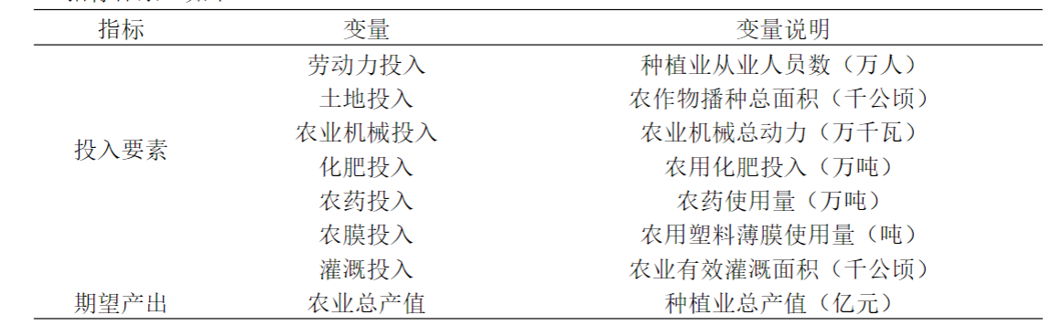 投入要素:劳动力投入、土地投入、农业机械投入、化肥投入、农药投入、农膜投入、灌溉投入