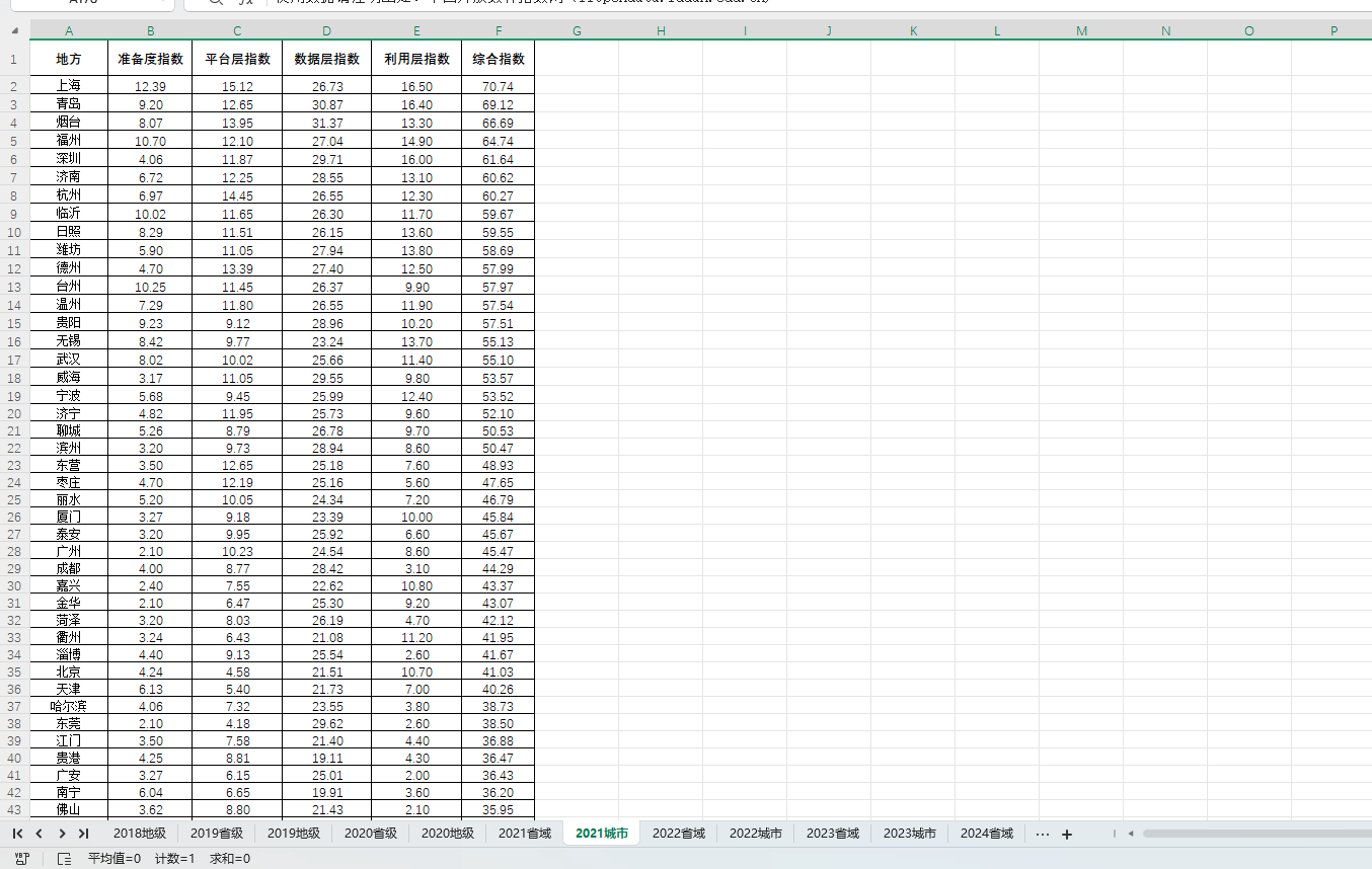 数据简介: “数林指数”是由复旦大学数字与移动治理实验室、复旦大学国家信息中心数字中国研院联合发布的科研指数,属于国家社科基金重大项目。该指数自 2017 年起定期评测地方公共数据开放利用水平,2024 年调整评估方法,坚守公共数据开放 “基本面”、将 “准备度” 更名 “保障层”、强化服务实效与数据质量、聚焦利用真成果。该指数将城市分为五档 “开放数级”,杭州、济南为 “五棵数”(杭州领跑保障 / 服务 / 数据层,济南领跑利用层),德州、温州等为 “四棵数”;“数林匹克” 指数显示杭州四年累计分值最高。整体而言,数林指数既可以用来量化各地开放差距、引导地方优化数据供给与服务,又可以用来推动开放数据服务民生(如停车导航、无障碍服务)与数字经济,助力构建 “开放数林” 生态,是研究公开数据平台建设质量的绝佳衡量工具,因此收集整理了2017年-2024年各地的数林指数分享给大家。