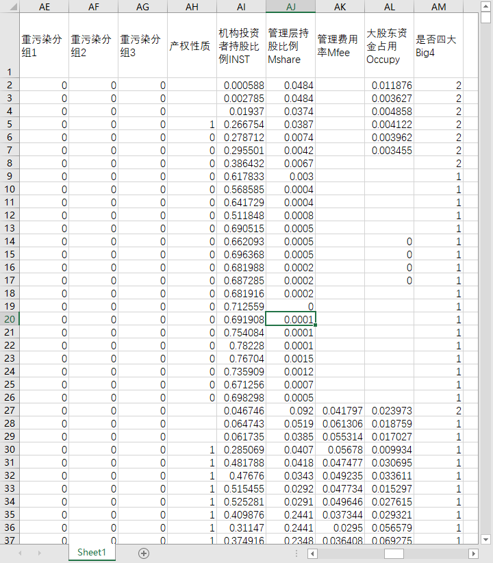 股票代码 年份 股票简称 行业名称 行业代码 制造业取两位代码,其他行业用大类 所属省份代码 所属省份 所属城市代码 所属城市 是否stpt 是否金融 是否制造业 是否深证上市 是否上证上市 是否沪深上市 是否北证上市 是否创业板 是否科创板 是否所属西部 是否所属东部 是否所属中部 高科技行业分组1 高科技行业分组2 高科技行业分组3 高科技行业分组4 高科技行业分组5 技术密集型 资产密集型 劳动密集型 重污染分组1 重污染分组2 重污染分组3 产权性质 机构投资者持股比例INST 管理层持股比例Mshare 管理费用率Mfee 大股东资金占用Occupy 是否四大Big4