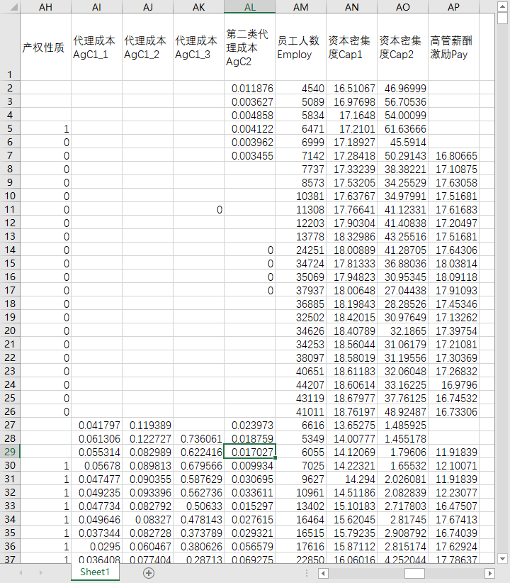 股票代码 年份 股票简称 行业名称 行业代码 制造业取两位代码,其他行业用大类 所属省份代码 所属省份 所属城市代码 所属城市 是否stpt 是否金融 是否制造业 是否深证上市 是否上证上市 是否沪深上市 是否北证上市 是否创业板 是否科创板 是否所属西部 是否所属东部 是否所属中部 高科技行业分组1 高科技行业分组2 高科技行业分组3 高科技行业分组4 高科技行业分组5 技术密集型 资产密集型 劳动密集型 重污染分组1 重污染分组2 重污染分组3 产权性质 代理成本AgC1_1 代理成本AgC1_2 代理成本AgC1_3 第二类代理成本AgC2 员工人数Employ 资本密集度Cap1 资本密集度Cap2 高管薪酬激励Pay