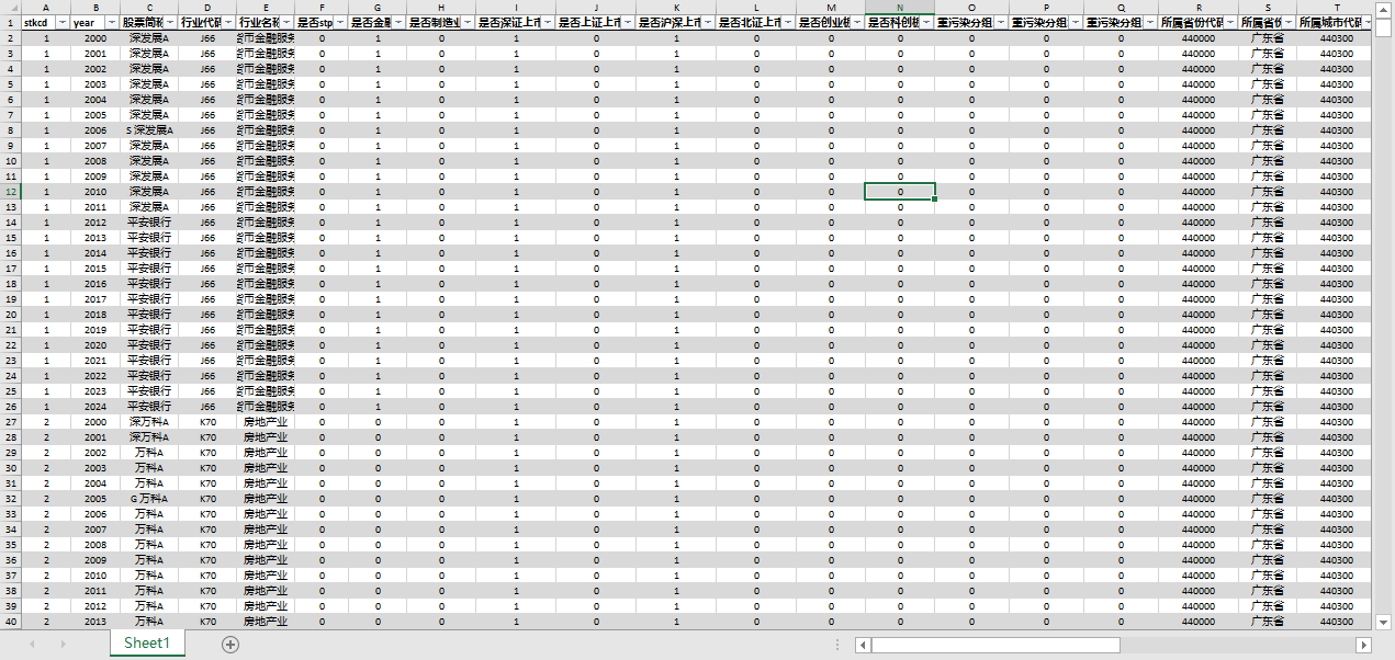 stkcd year 股票简称 行业代码 行业名称 是否stpt 是否金融 是否制造业 是否深证上市 是否上证上市 是否沪深上市 是否北证上市 是否创业板 是否科创板 重污染分组1 重污染分组2 重污染分组3 所属省份代码 所属省份 所属城市代码 所属城市 是否属于西部 是否属于东部 是否属于中部 产权性质 是否高科技行业1 是否高科技行业2 是否高科技行业3 是否高科技行业4 是否高科技行业5 技术密集型 资产密集型 劳动密集型