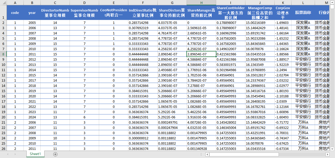 code year DirectortorNumb董事会规模 SupervisorNumb监事会规模 CeoNotPresident两职合一 IndDirectRatio独立董事比例 ShareDirctors董事会持股比例 ShareManager高管持股比例 ShareContHolder第一大股东持股比例 ManagerComp前三位高管的薪酬之和 CorpGov治理水平 股票简称 行业名称 行业代码 所属省份代码 所属省份 所属城市代码 所属城市 是否stpt 是否金融 是否制造业 是否沪深上市 成立年份 上市年份