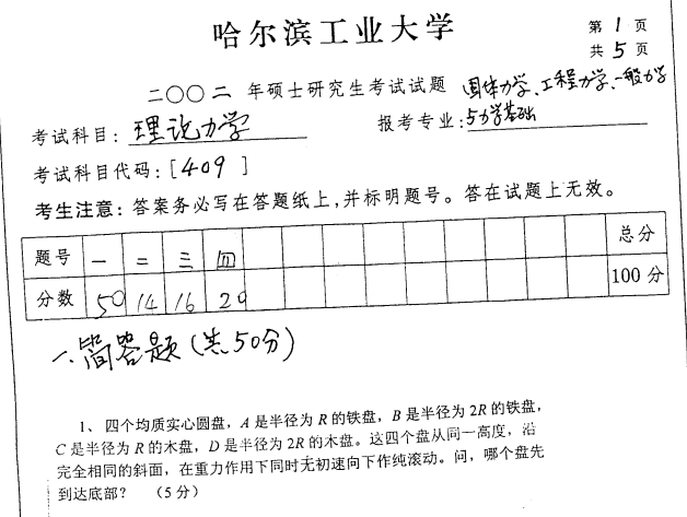 哈工大哈尔滨工业大学理论力学考研真题98 99 00 02