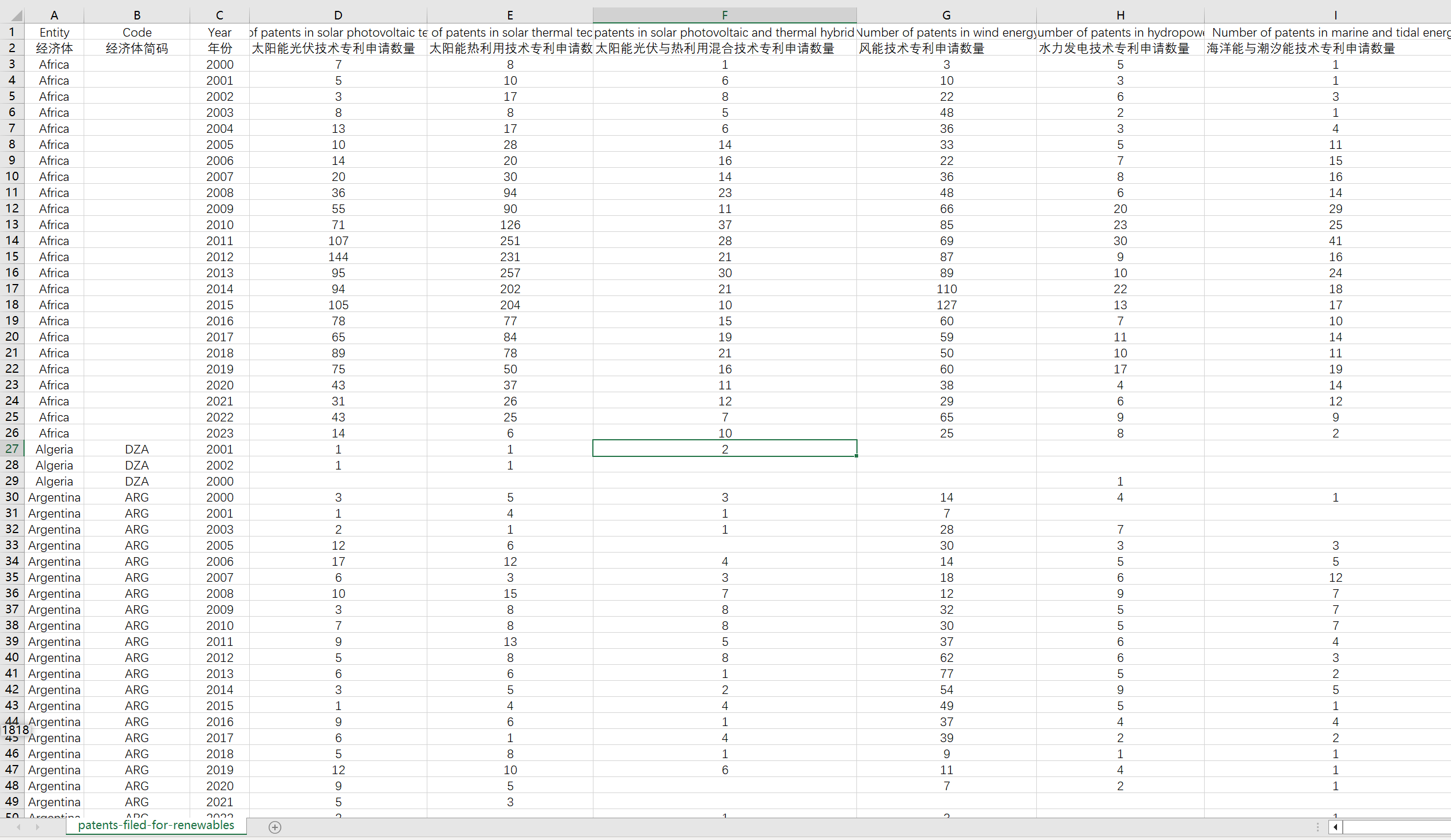 碳捕获与封存技术专利申请量/储能技术专利申请量/可再生能源技术专利申请量/发展中国家获得得到清洁能源国际融资额等2023年!最新数据!已经整理成面板数据可以直接使用!