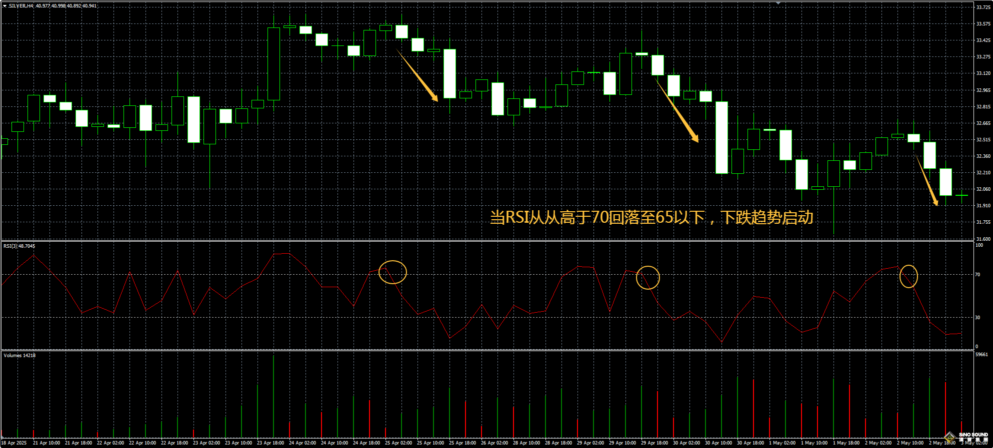 1. 突破超卖/超买区域的折返:当RSI从低于30的超卖区域回升至35以上,或从高于70的超卖区域回落至65以下时,往往意味着原有趋势动能减弱,新趋势即将启动。