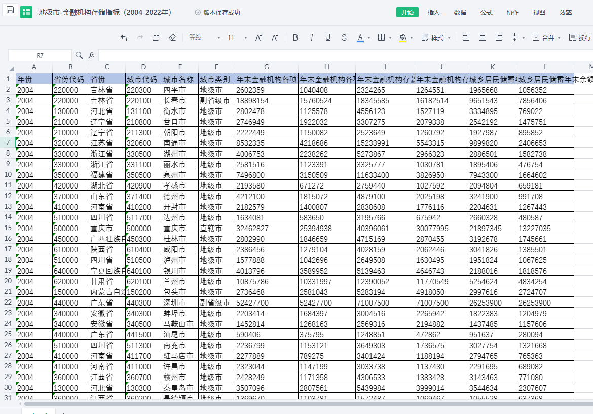 包含指标:年份 省份代码 省份 城市代码 城市名称 城市类别 年末金融机构各项贷款余额-全市(万元) 年末金融机构各项贷款余额-市辖区(万元) 年末金融机构存款余额-全市(万元) 年末金融机构存款余额-市辖区(万元) 城乡居民储蓄年末余额-全市(万元) 城乡居民储蓄年末余额-市辖区(万元)