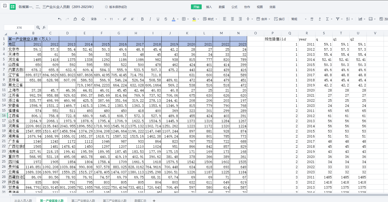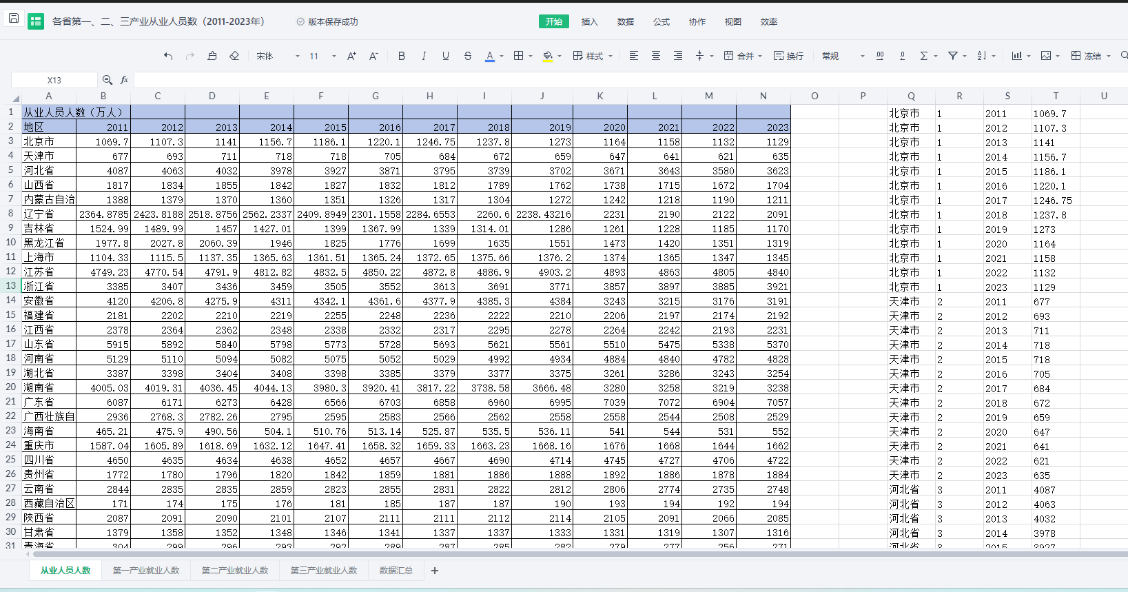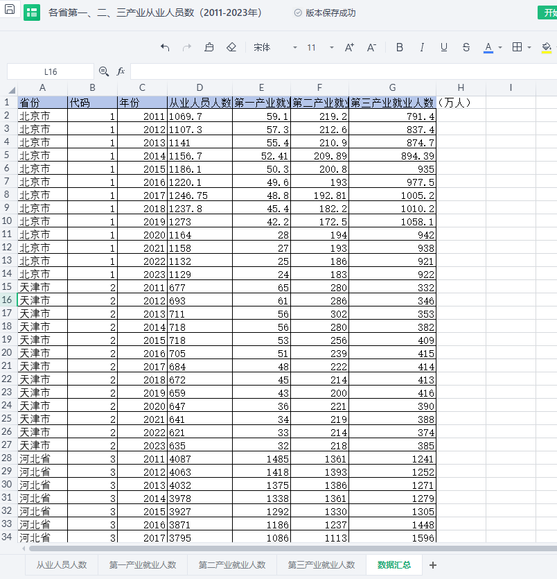 包含指标:省份 代码 年份 从业人员人数(万人) 第一产业就业人数(万人) 第二产业就业人数(万人) 第三产业就业人数(万人)