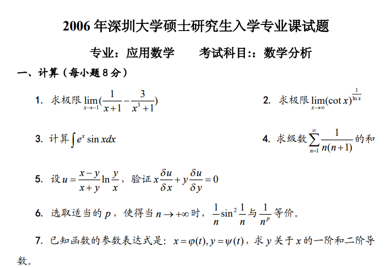 深圳大学数学分析考研真题2006无答案