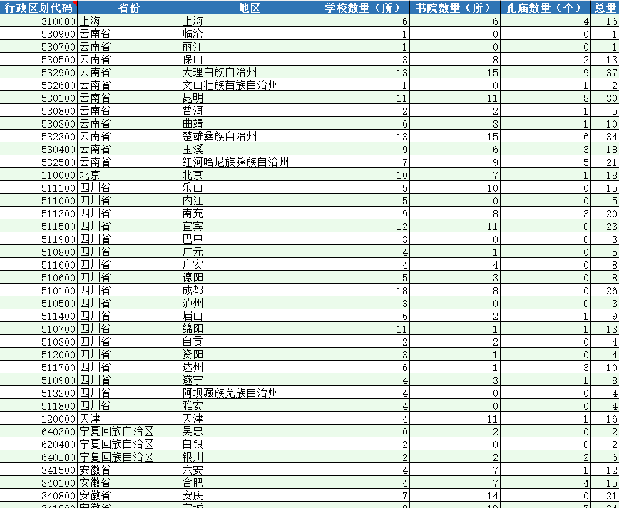 二. 数据指标| 行政区划代码 | 省份 | 地区 | 学校数量所 | 书院数量所 |