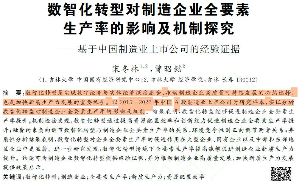 [1]宋冬林,曾昭懿.数智化转型对制造企业全要素生产率的影响及机制探究——基于中国制造业上市公司的经验证据[J/OL].科技进步与对策,1-12[2025-04-02]