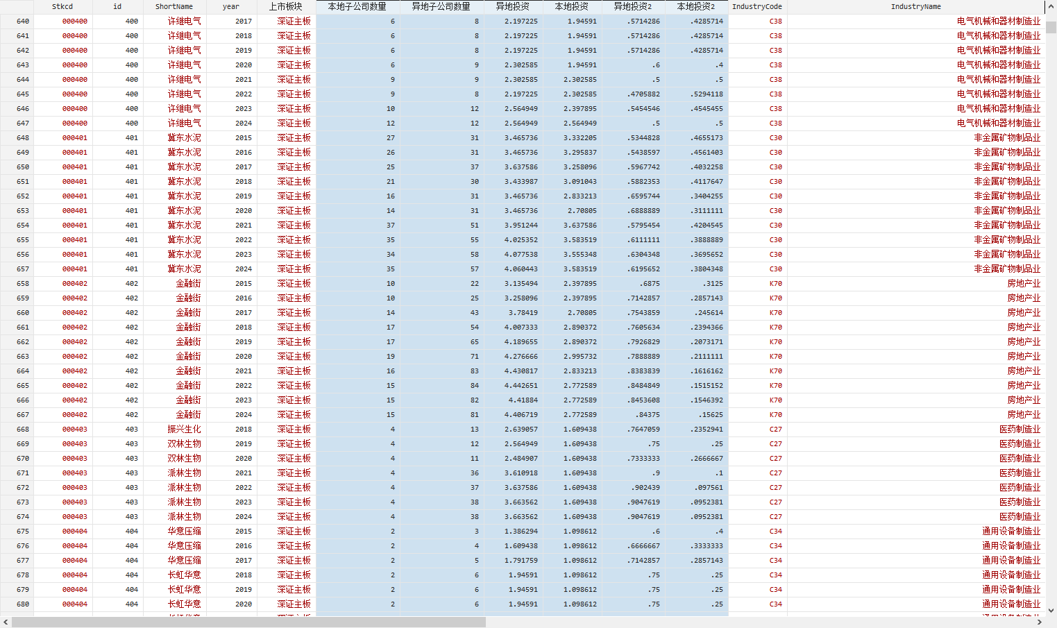 上市公司企业异地投资异地子公司数据2005-2023跨省投资资本跨区流动省份城市行业名称