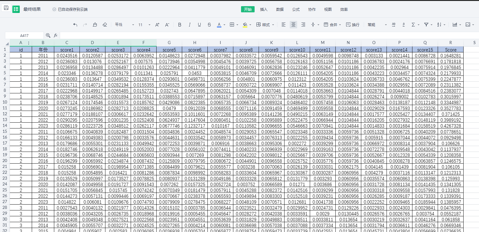 id 年份 score1 score2 score3 score4 score5 score6 score7 score8 score9 score10 score11 score12 score13 score14 score15 Score