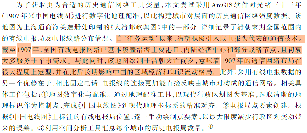 截至1907年,全国有线电报网络已基本覆盖沿海主要港口、内陆经济中心和部分战略节点。《大清邮政舆图》绘制于清朝灭亡前夕,意味着1907年的通信网络布局在很大程度上定型,并在此后长期影响中国的区域经济和知识流动格局。本次分享的数据是[url=]地级市在1907年的历史电报局数量,可作为历史通信网络的工具变量[/url]