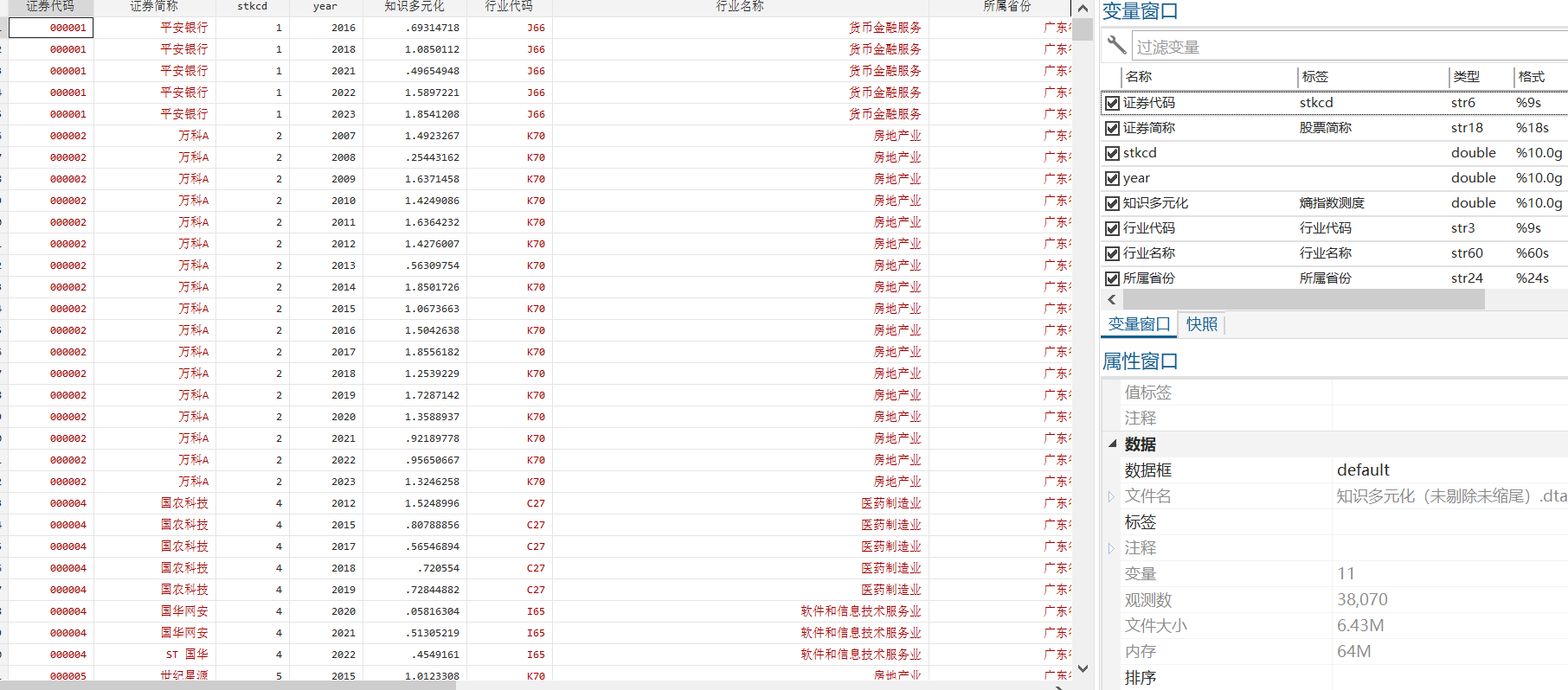【知识多元化】参考文献中的公式计算熵指数,特别地应当注意,文献中熵指数公式编写有误,熵指数公式应当为:知识多元化=∑pi ln(1/pi),这里文献应当仅是文本编辑失误,因为其数据描述性统计显示正常。其中,pi表示企业技术类别i的专利数量占企业专利总数的比重