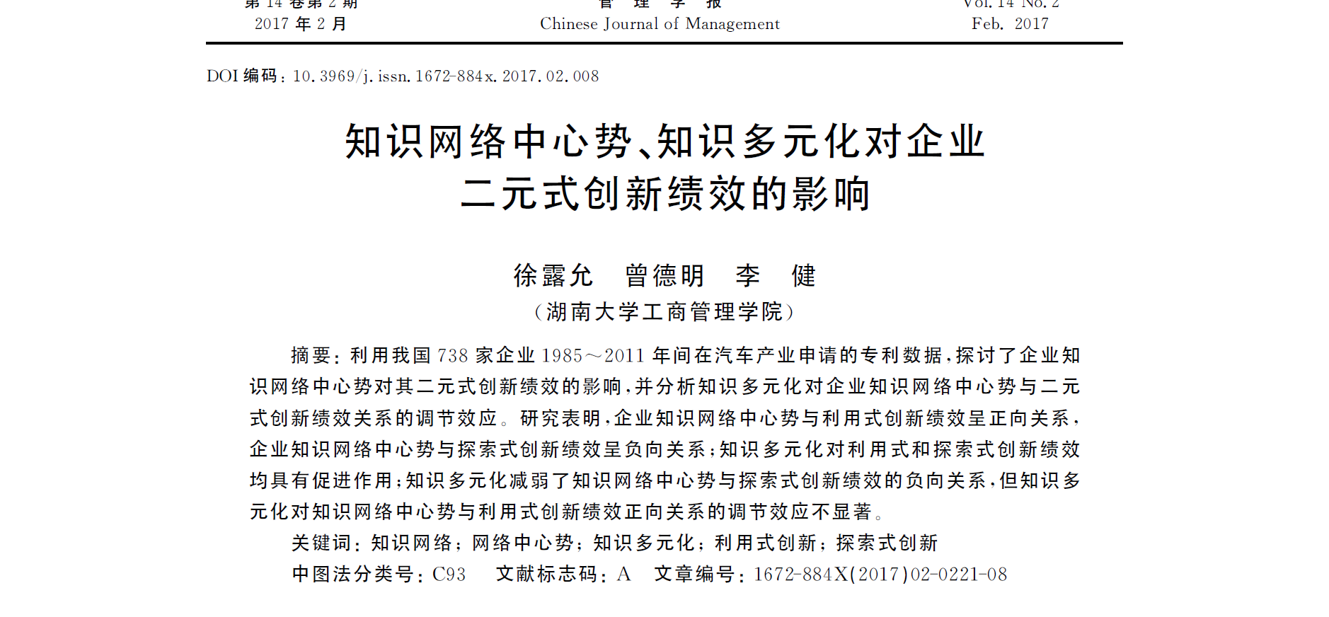 参考文献:知识网络中心势、知识多元化对企业二元式创新绩效的影响-徐露允