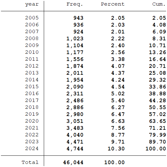 样本选择:全部A股2005-2024年数据(因从2005年起才强制要求公司在年报中披露管理者薪酬数据,故超额薪酬数据始于2005年)