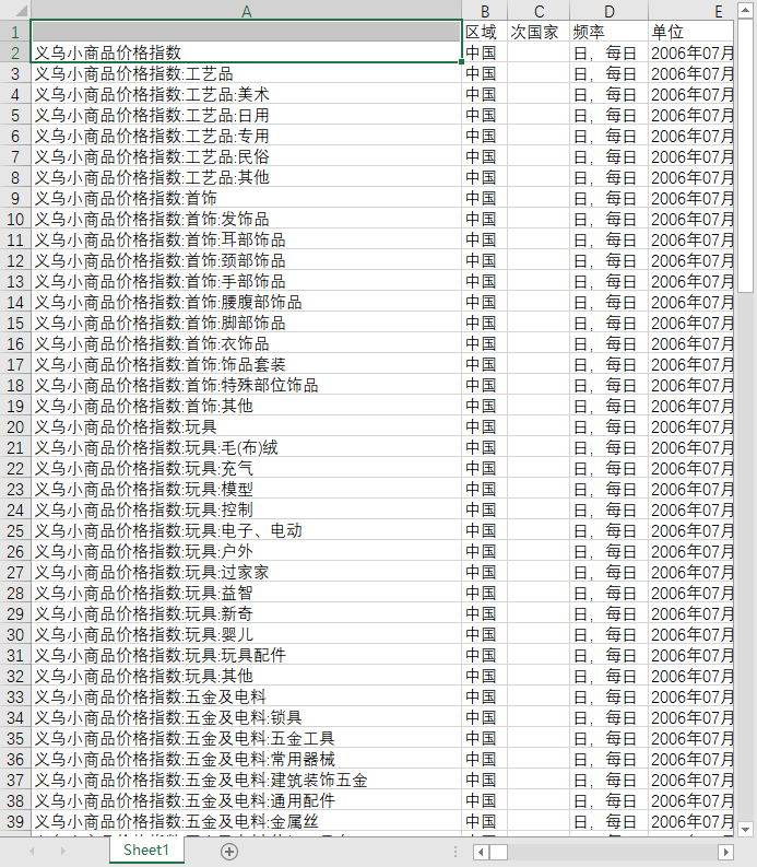 义乌小商品价格指数 义乌小商品价格指数:工艺品 义乌小商品价格指数:首饰 义乌小商品价格指数:玩具 义乌小商品价格指数:五金及电料 义乌小商品价格指数:电子电器 义乌小商品价格指数:钟表眼镜 义乌小商品价格指数:文化办公用品 义乌小商品价格指数:体育娱乐用品 义乌小商品价格指数:服装服饰 义乌小商品价格指数:鞋 义乌小商品价格指数:针、纺织品 义乌小商品价格指数:箱包 义乌小商品价格指数:护理及美容用品 义乌小商品价格指数:日用品 义乌小商品价格指数:辅料和包装 (DC)义乌小商品价格指数:雨具