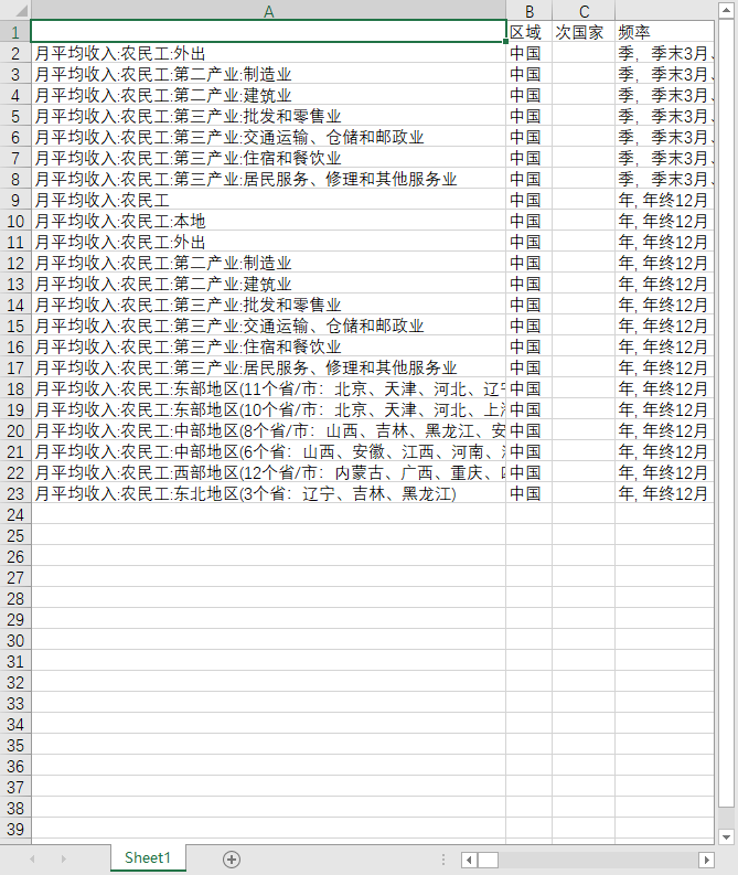 月平均收入:农民工:东北地区(3个省:辽宁、吉林、黑龙江)