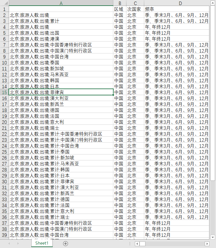 旅游业北京出境人数出国旅游到全球世界各国地区2009-2024季度2000-2024年度数