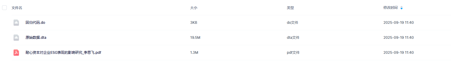 本文参照李思飞(2025)的做法,对来自经济问题《耐心资本对企业ESG表现的影响研究》一文中的基准回归部分进行复刻。核心变量耐心资本参考《科学决策》中吴旻佳等(2022)、《财会月刊》中李季鹏等(2025)的研究方法,采用关系型债权占比对其进行衡量。