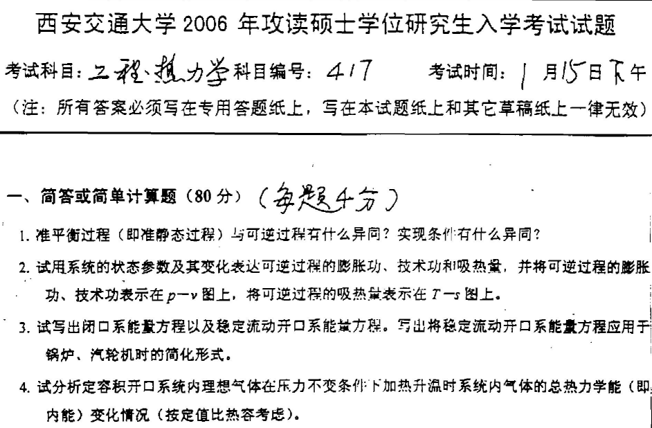 西安交大西安交通大学考研真题工程热力学(无答案)98 99 00 02 03 04 05 06 08