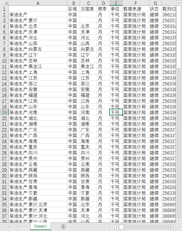 每个指标的数据大致如下(以柴油为例):