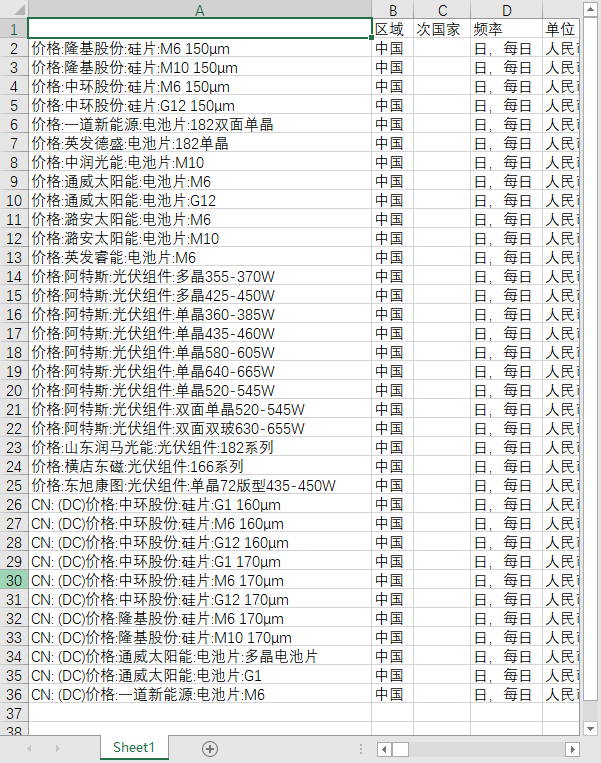 价格:多晶硅:多晶用料 价格:多晶硅:致密料 价格:硅片:多晶硅片 价格:硅片:G1 价格:硅片:M6 价格:硅片:M10 价格:硅片:G12 价格:电池片:多晶电池片 价格:电池片:G1 价格:电池片:M6 价格:电池片:M10 价格:电池片:G12 价格:光伏组件:多晶组件 价格:光伏组件:158单晶组件 价格:光伏组件:166单晶组件 价格:光伏组件:182单晶组件 价格:光伏组件:210单晶组件