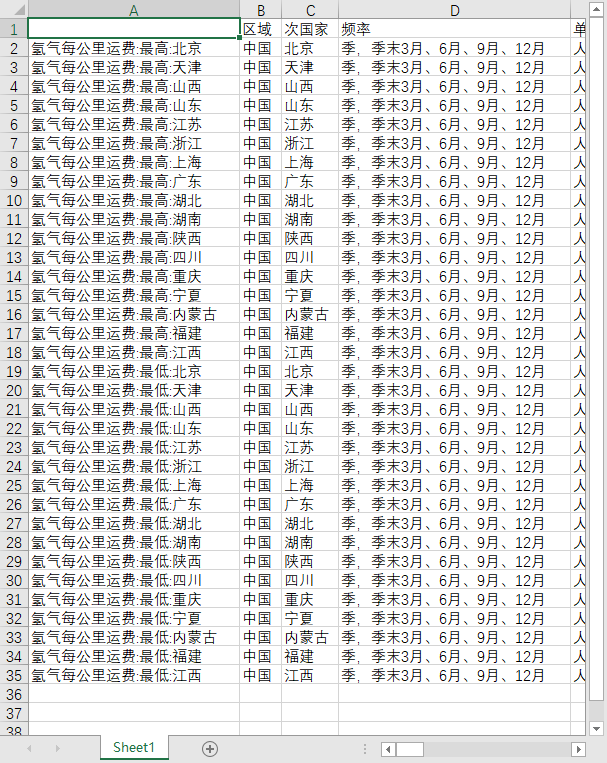 全国新能源氢气每公里运费分省份地区2020-202506季度数据