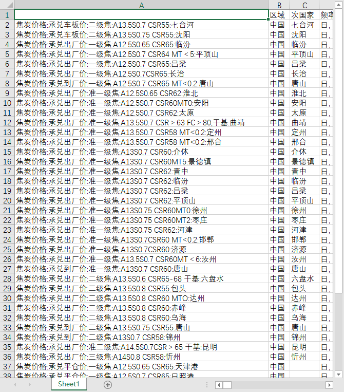 炼焦煤价格:车板价:1/3焦煤:淮南 炼焦煤价格:车板价:1/3焦煤:平顶山 炼焦煤价格:车板价:肥煤:淮北 炼焦煤价格:车板价:主焦煤:淮北 炼焦煤价格:车板价:主焦煤:平顶山 炼焦煤价格:出厂价:1/3焦煤:菏泽 炼焦煤价格:出厂价:1/3焦煤:鸡西 炼焦煤价格:出厂价:1/3焦煤:盘县 炼焦煤价格:出厂价:1/3焦煤:蒲县 炼焦煤价格:出厂价:1/3焦煤:双鸭山 炼焦煤价格:出厂价:1/3焦煤:乌海 炼焦煤价格:出厂价:1/3焦煤:徐州 炼焦煤价格:出厂价:低硫主焦煤:安泽 炼焦煤价格:出厂价:低硫主焦煤:柳林 炼焦煤价格:出厂价:肥煤:邯郸 炼焦煤价格:出厂价:肥煤:济宁 炼焦煤价格:出厂价:肥煤:灵石 炼焦煤价格:出厂价:肥煤:七台河 炼焦煤价格:出厂价:肥煤:唐山 炼焦煤价格:出厂价:肥煤:乌海 炼焦煤价格:出厂价:气煤:兴县 炼焦煤价格:出厂价:瘦煤:韩城 炼焦煤价格:出厂价:瘦煤:长治 炼焦煤价格:出厂价:主焦煤:肥城 炼焦煤价格:出厂价:主焦煤:古交 炼焦煤价格:出厂价:主焦煤:邯郸 炼焦煤价格:出厂价:主焦煤:介休 炼焦煤价格:出厂价:主焦煤:盘县 炼焦煤价格:出厂价:主焦煤:七台河 炼焦煤价格:出厂价:主焦煤:曲靖 炼焦煤价格:出厂价:主焦煤:唐山 炼焦煤价格:出厂价:主焦煤:邢台
