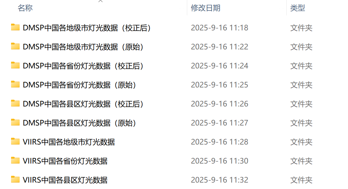 夜间灯光数据是利用遥感卫星捕获地表人工光源辐射强度形成的空间数据,其核心意义在于将人类经济社会活动的“隐性动态”转化为可视化、可量化的指标。由于其稳定性和广覆盖性,该数据近年来被广泛应用于经济地理学、城市规划、区域发展、人口迁移监测、贫困识别及环境研究等领域。本数据集基于美国国家海洋和大气管理局(NOAA)的NPP-VIIRS与DMSP-OLS数据,覆盖1992–2024年我国省、市、县多层级空间单元,可支持宏观到微观的多尺度研究。