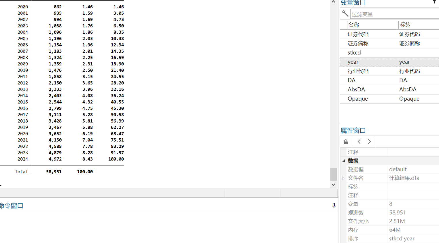 也有参考文献使用法过去三年操控性应计项目绝对值之和( Opaque) 来衡量公司信息透明度gen Opaque=abs(L.DA)+abs(L2.DA)+abs(L3.DA)