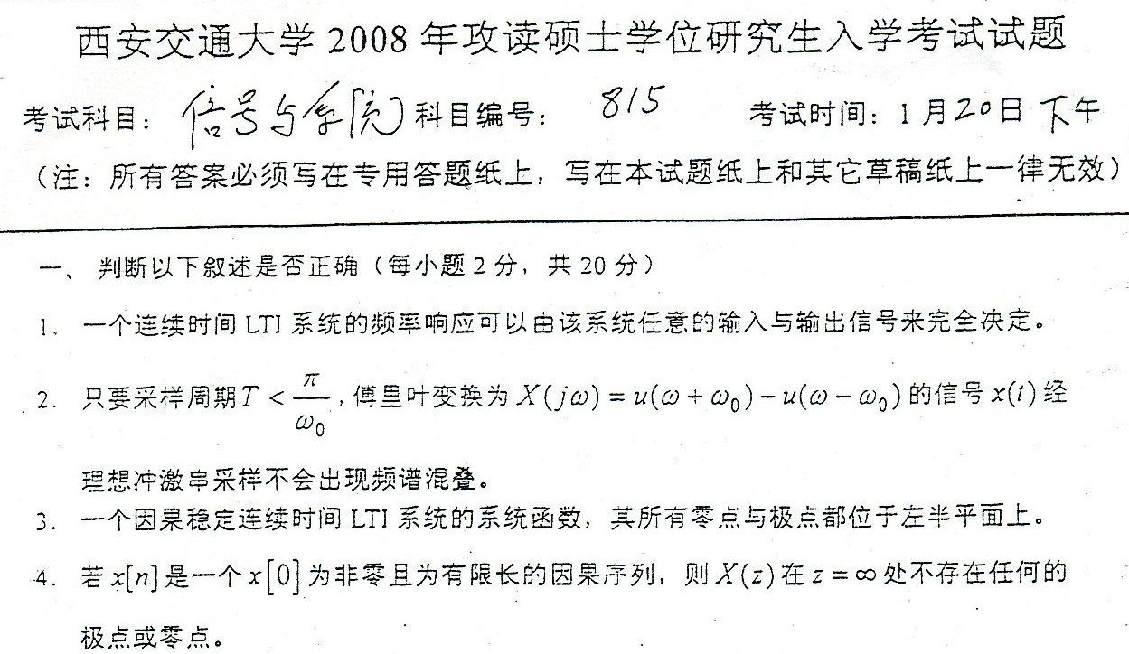 西安交大西安交通大学信号与系统考研真题