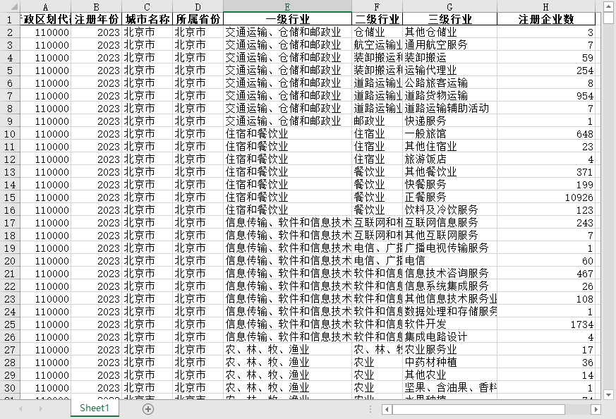 行政区划代码 注册年份 城市名称 所属省份 一级行业 二级行业 三级行业 注册企业数