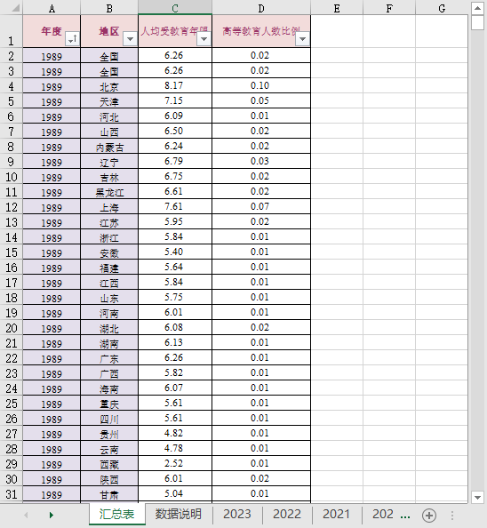全国31个省份人均受教育年限高等教育人数比例1989-2023小学初中高中大学专科本科