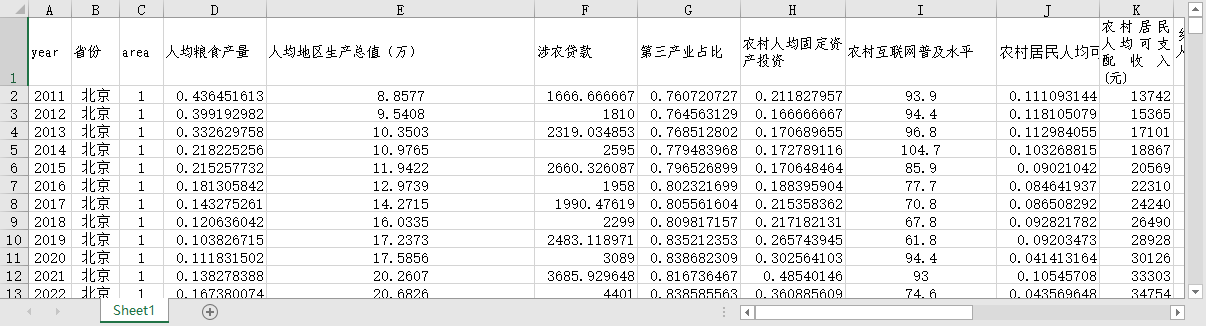 year 省份 area 人均粮食产量 人均地区生产总值(万) 涉农贷款 第三产业占比 农村人均固定资产投资 农村互联网普及水平 农村居民人均可支配收入增长率 农村居民人均可支配收入(元) 乡村就业人员数(万人) 农村受教育年限 村卫生室个数(个) 森林覆盖率 化肥施用强度 节能环保支出强度 农村经济韧性熵值法测度结果