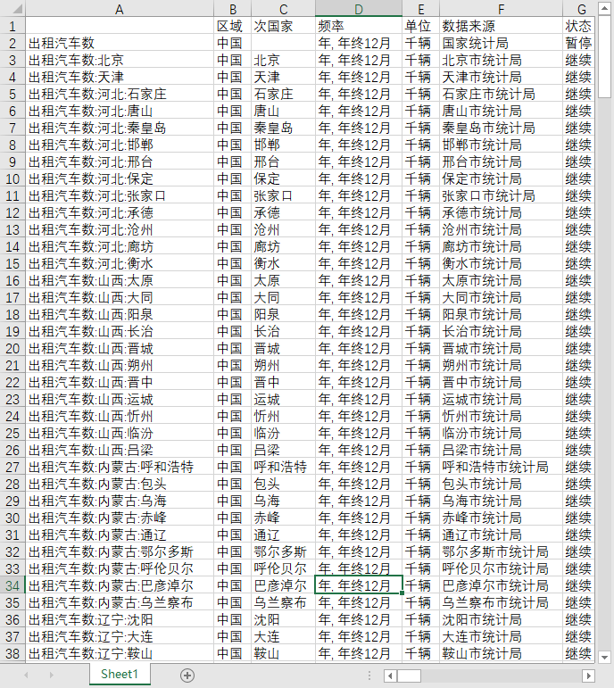 每个指标一个数据文件,每个数据文件包含近300个地级市城市:
