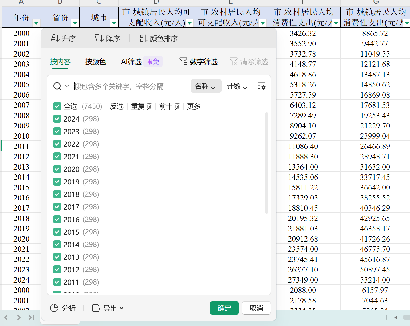 年份 省份城市 市-城镇居民人均可支配收入(元/人) 市-农村居民人均可支配收入(元/人) 市-农村居民人均消费性支出(元/人) 市-城镇居民人均消费性支出(元/人)