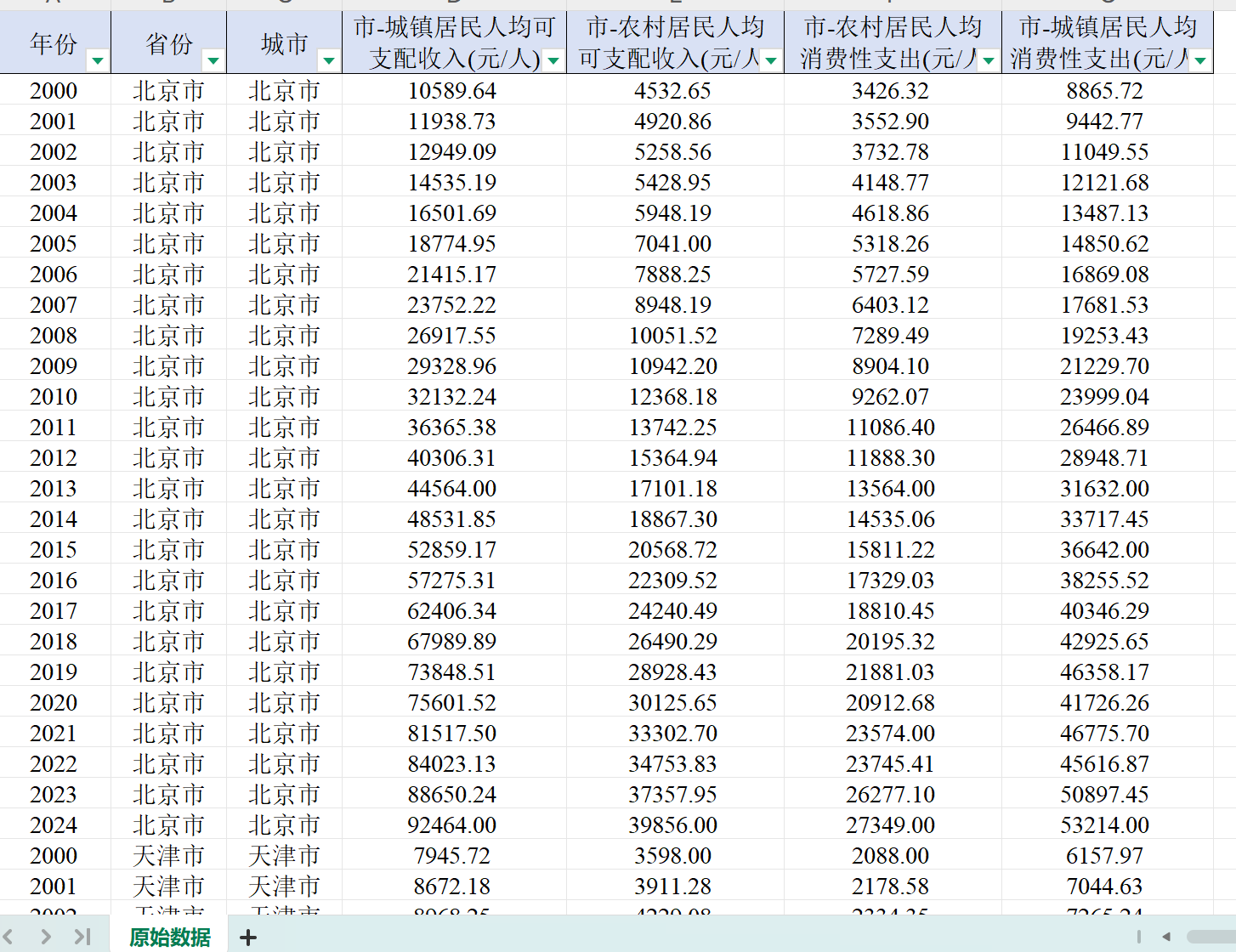 各地级市城镇农村居民人均可支配收入/消费性支出数据2000-2024年