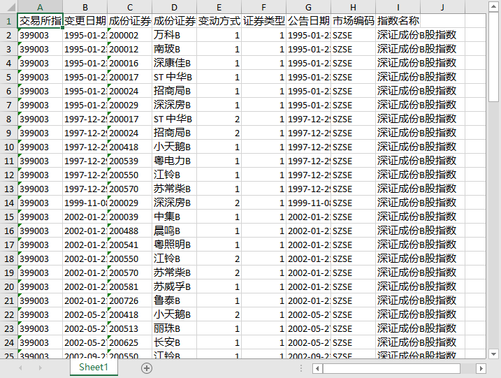 交易所指数代码 | 变更日期 | 成份证券代码 | 成份证券简称 | 变动方式 | 证券类型 | 公告日期 | 市场编码 | 指数名称