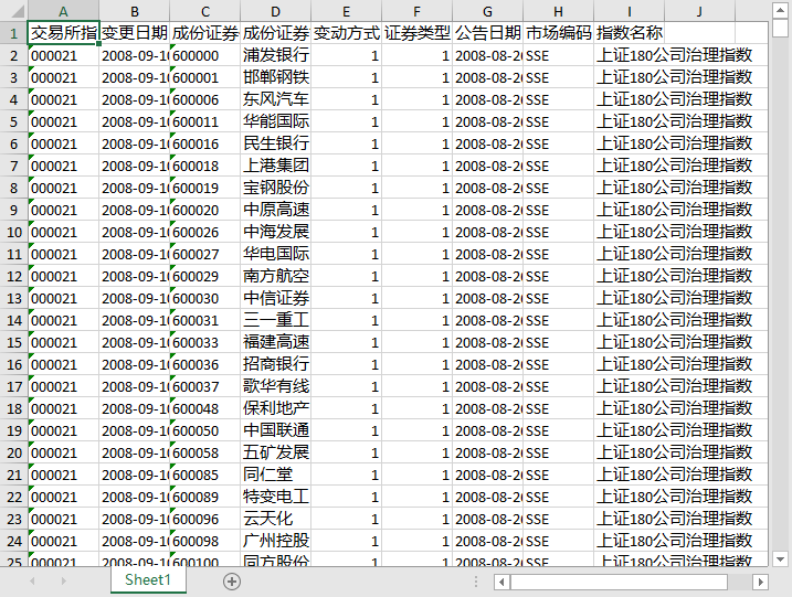 交易所指数代码 | 变更日期 | 成份证券代码 | 成份证券简称 | 变动方式 | 证券类型 | 公告日期 | 市场编码 | 指数名称