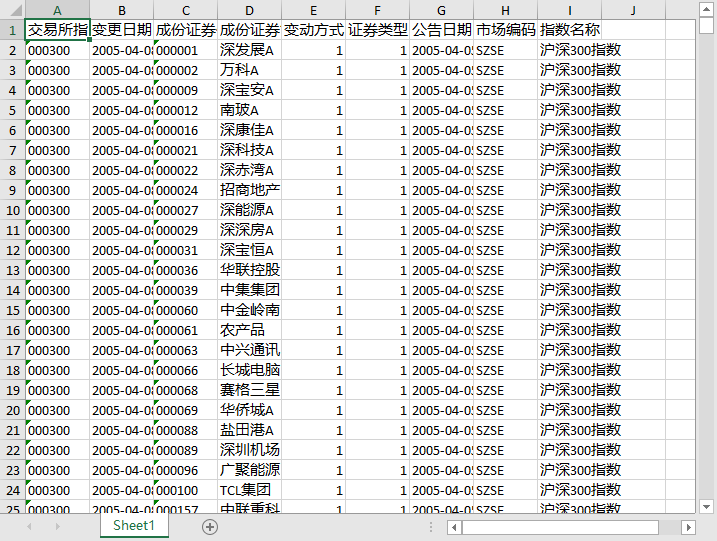 交易所指数代码 | 变更日期 | 成份证券代码 | 成份证券简称 | 变动方式 | 证券类型 | 公告日期 | 市场编码 | 指数名称