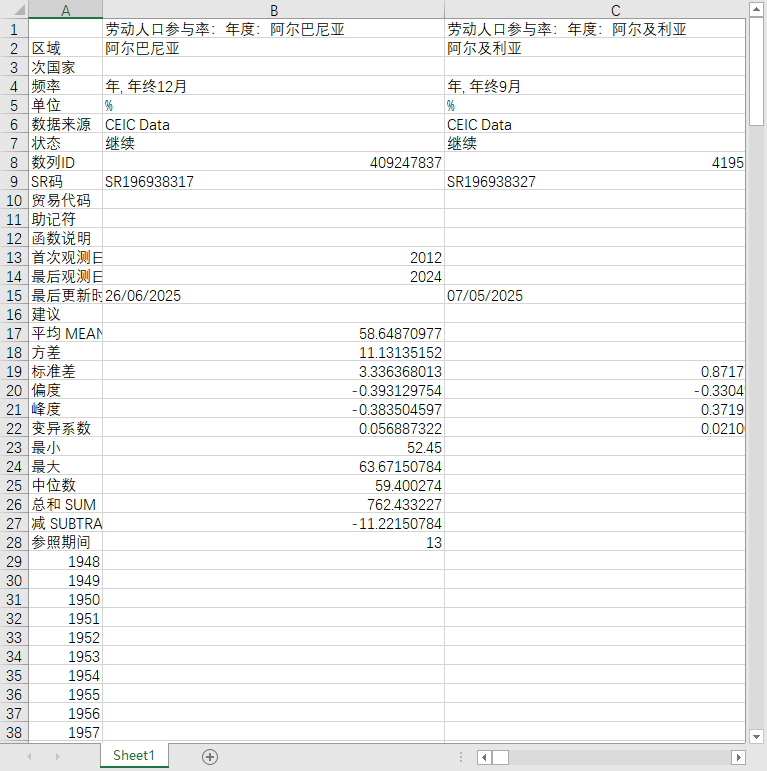 全球世界各国地区劳动人口参与率2000-202506月度季度年度数据