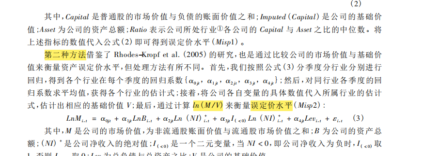 先根据行业内所有公司推算出公司的基础价值, 进而通过对公司的实际价值与基础价值进行对比, 来衡量公司相对于业内同行的误定价水平。计算公式如下: