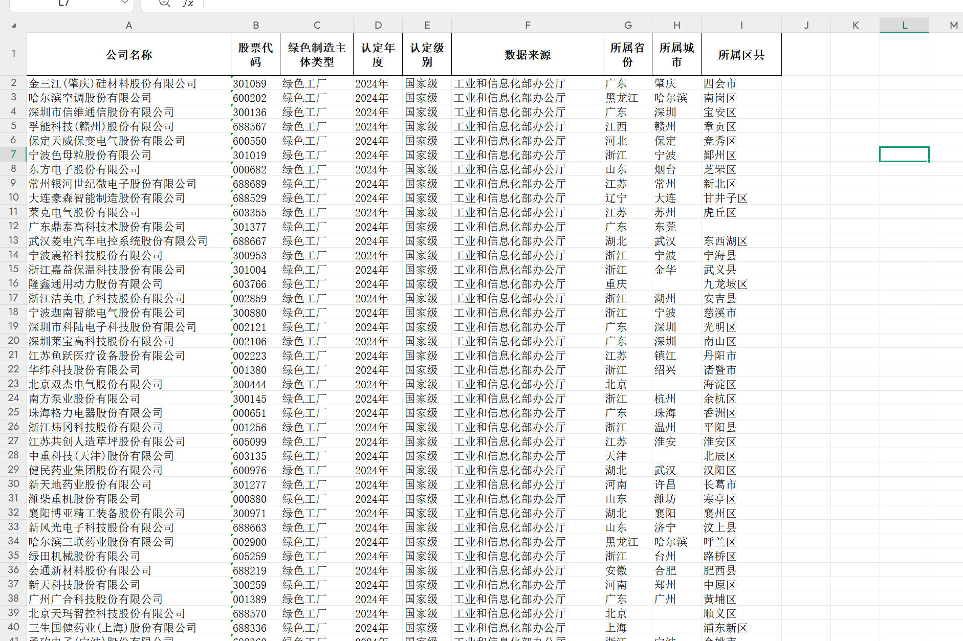 数据指标:公司名称 股票代码 绿色制造主体类型 认定年度 认定级别 数据来源 所属省份 所属城市 所属区县 上市公司绿色制造包括四类,分别为绿色工厂、绿色供应链管理企业、绿色产品设计企业、工业绿色产品设计示范企业 资料范围:3500多个样本,1350家企业,根据数据来源爬取后核对后整理成电子表格