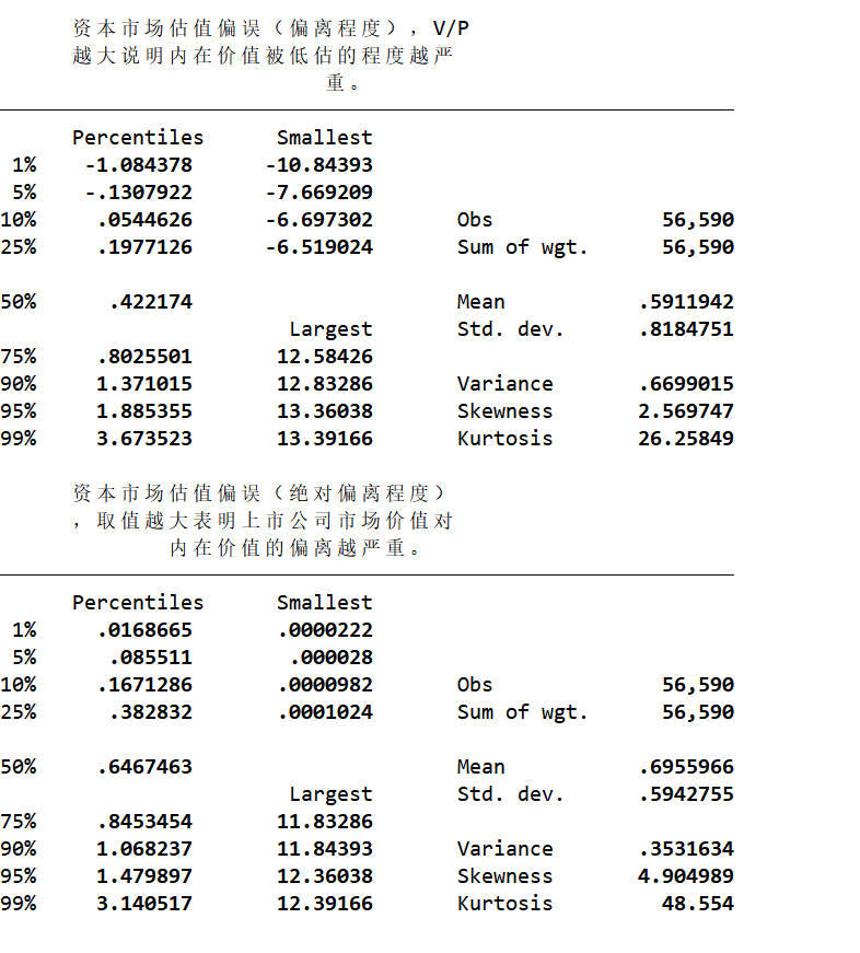 首先,我们采用内在价值与市场价值之比V/P度量上市公司市场价值对内在价值的偏离程度。上市公司每股内在价值V由剩余收益模型(RIM)估计得出,P为该公司股票当年所有交易日收盘价的平均值。V/P=1表明上市公司市值(理论上)完美地体现了内在价值;V/P<1表明市场高估了上市公司的内在价值,且V/P越小说明内在价值被高估的程度越严重;V/P>1则表明市场低估了上市公司的内在价值,且V/P越大说明内在价值被低估的程度越严重。