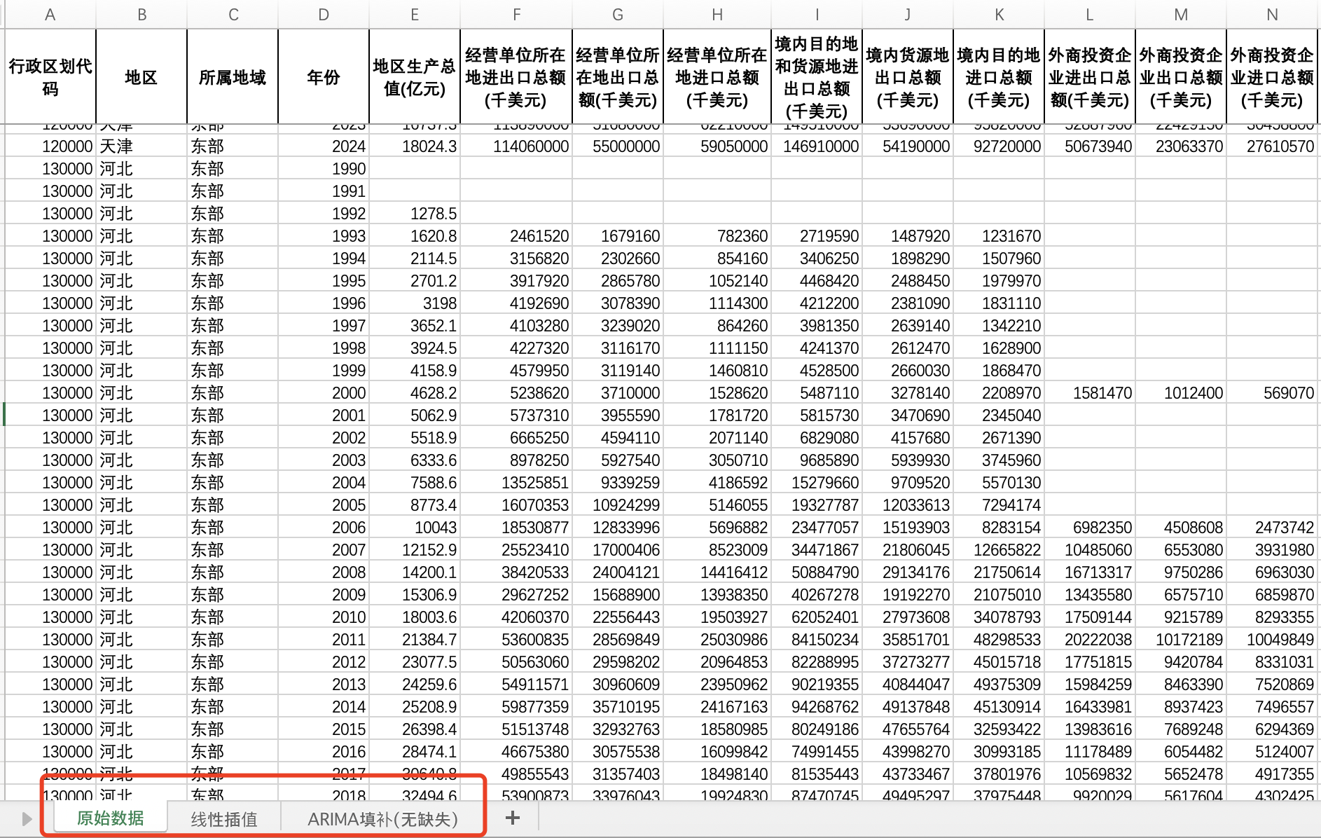全国31省份进出口数据进口额出口额分经营单位货源地外商投资(1990-2024年)(插值无缺失版)