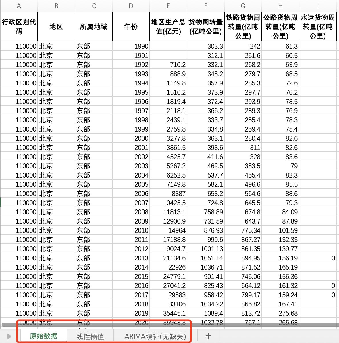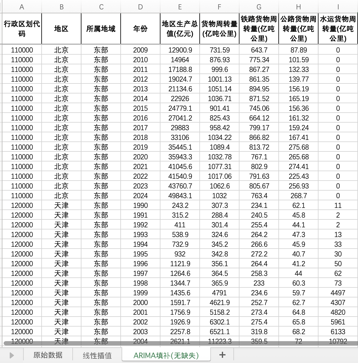 数据版本:原始数据版、线性插值版、ARIMA填补版(无缺失)